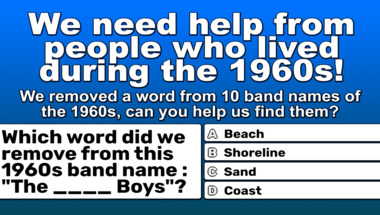 In this fun 1960s bands with a missing word quiz we're going to ask questions like "Which word did we remove from this 1960s band name : "The ____ Boys"?" and "Which word did we remove from this 1960s band name : "Ike & Tina ____"?".