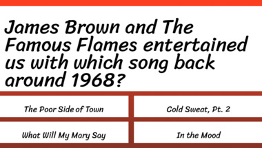 4/10 is what people on average are scoring in this 1960s Songs quiz so far. Are you ready to answer questions like "The Mama's and The Papa's entertained us with which song back around 1968?" and "The Hollies entertained us with which song back around 1968?"